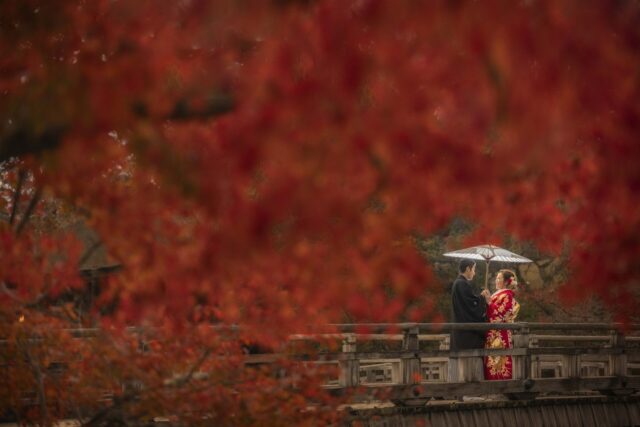 順番に紅葉し始める木々は12月中旬に紅葉が散るまで、お二人を彩ります。